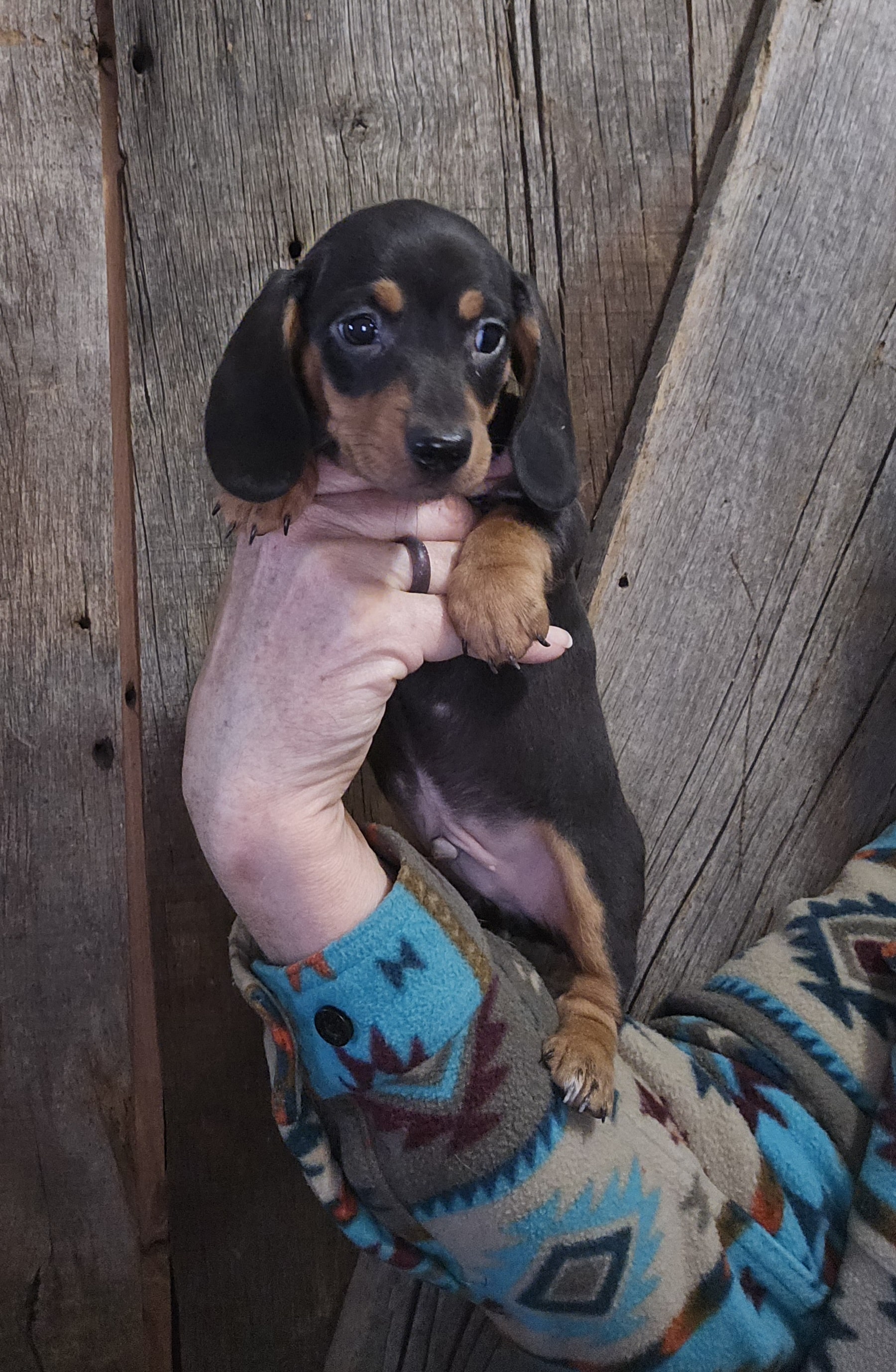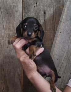 This is Rylee’s black and tan smooth hair male AKC miniature dachshund puppy #2 born 12-4-25.