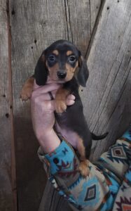 This is Rylee’s black and tan smooth hair male AKC dachshund puppy #1 born 12-4-25.