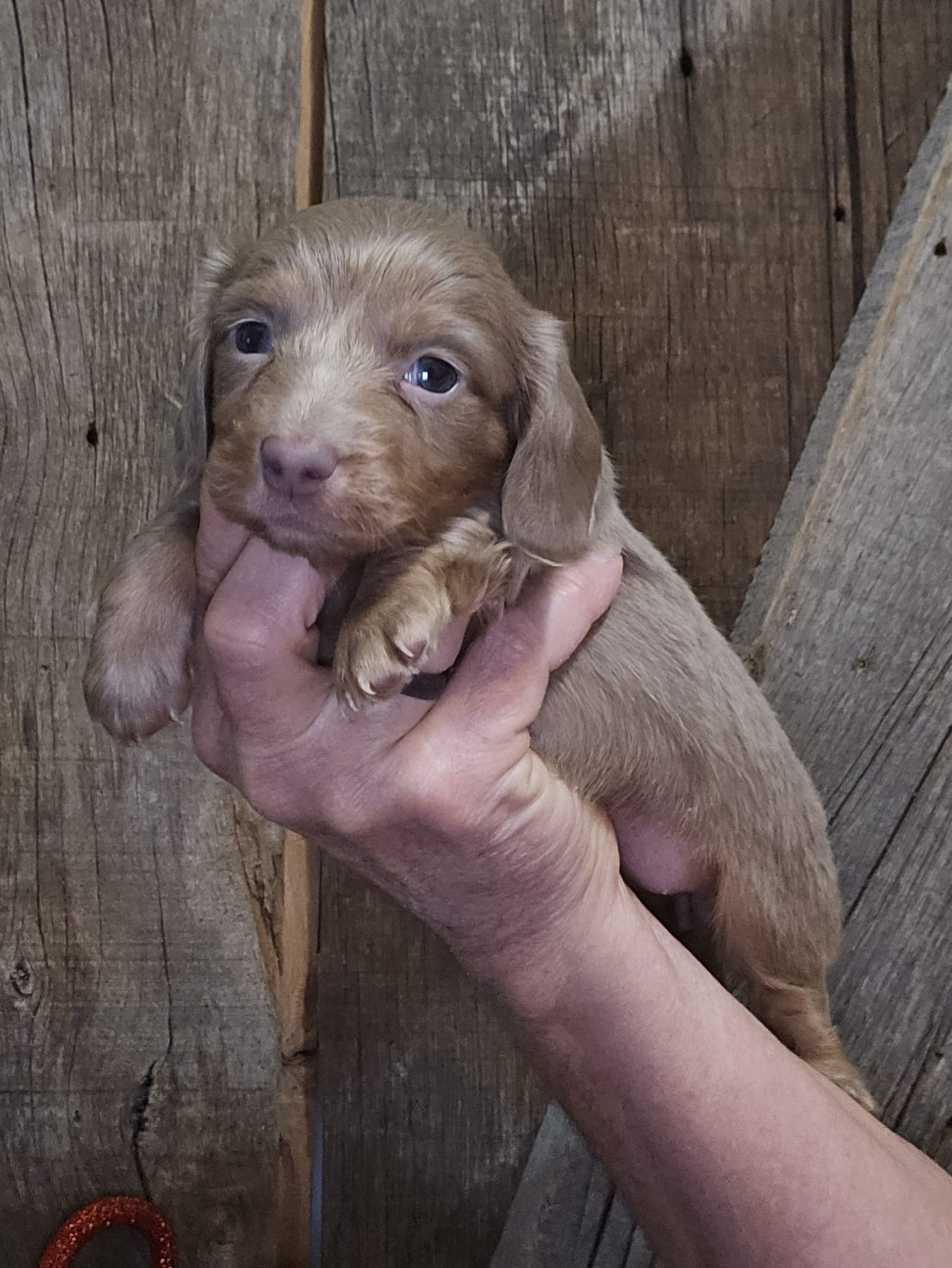 This is Rylee’s isabella and tan long hair female AKC miniature dachshund puppy #4 born 12-4-25